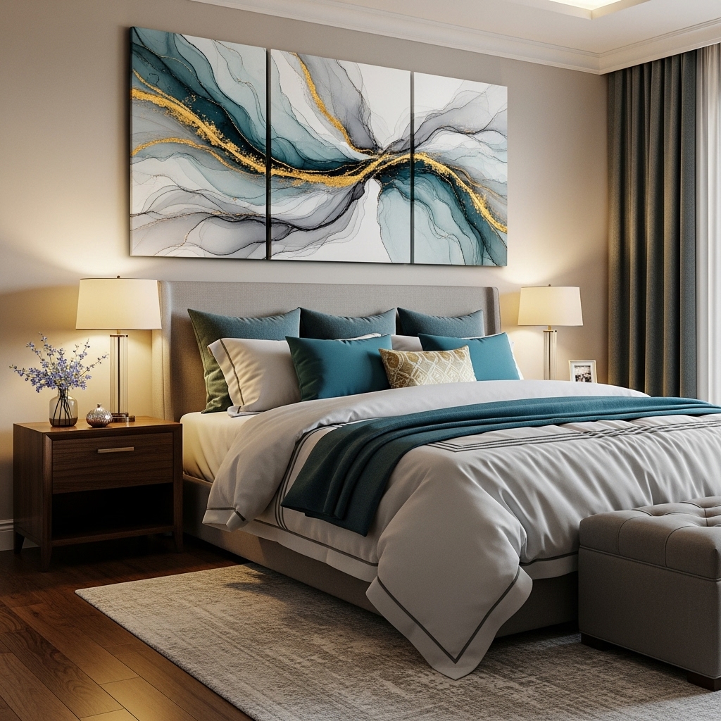 Place a massive abstract canvas above the headboard to set a calming color mood.