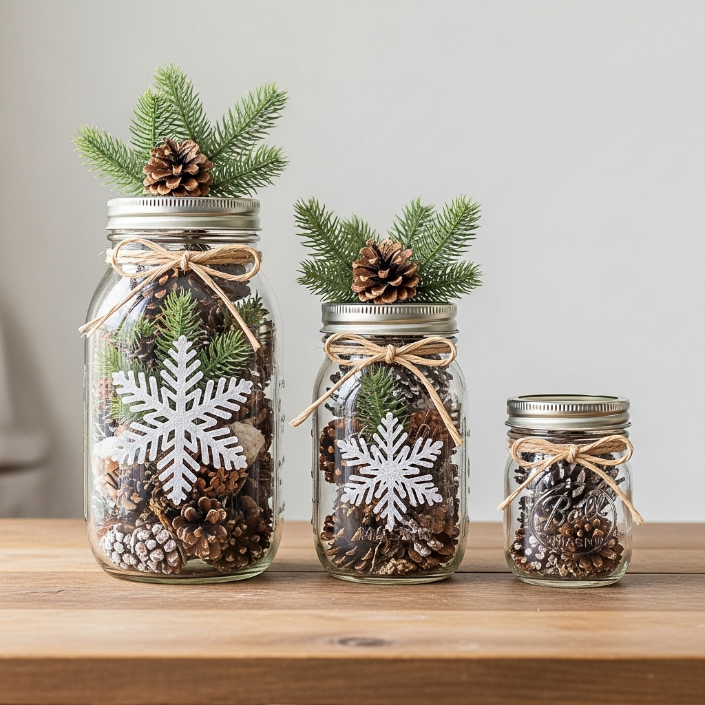 DIY mason jar displays are budget-friendly and charming for adding winter magic to any small space. Fill jars with faux snow, tiny evergreens, pinecones, or fairy lights to create glowing vignettes on shelves or tables, bringing a whimsical, handmade touch to your seasonal decor.