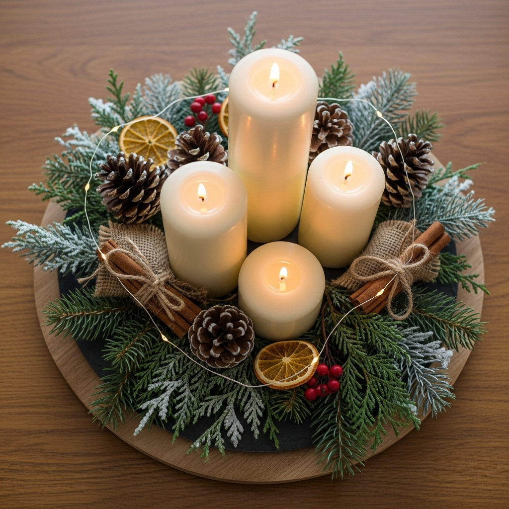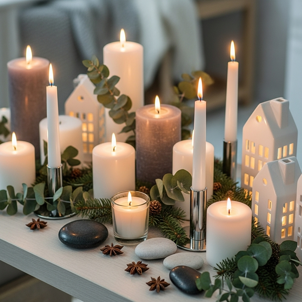 Scandinavian-inspired candle displays embody hygge with their simple, cozy elegance. Group white pillar candles of different heights alongside pinecones on a wooden tray for a clean, warming centerpiece that promotes relaxation and brings soft light to dark winter days.