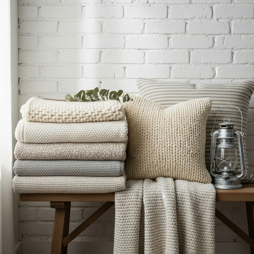 Choose soft materials like wool, chunky knits, or faux fur in neutral shades such as cream, beige, and soft gray to create a calm, inviting layered look on your sofa or armchairs.