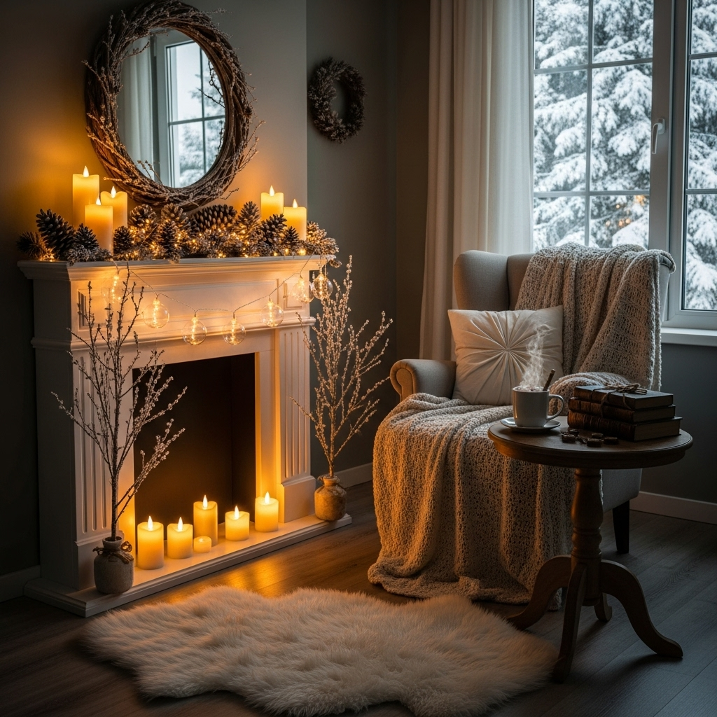 Placing lanterns with soft, battery-powered lighting in the entryway sets a welcoming tone right from the door. Metal or wooden lanterns filled with warm LED candles create a gentle glow that combats the winter chill, making your home feel instantly inviting and cozy as soon as you or guests step inside.