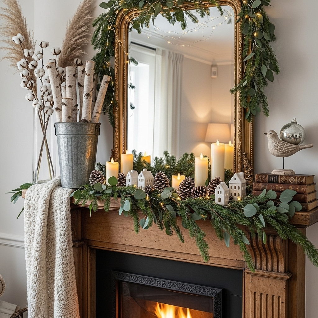 Incorporate fresh or faux pine branches, scattered pinecones, and clusters of white candles for an understated, elegant display that feels organic and timeless.
