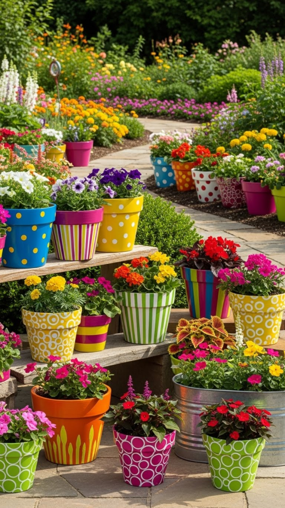 Brightly painted pots add energy and personality to your garden. They can coordinate with your flowers or contrast for a bold statement.