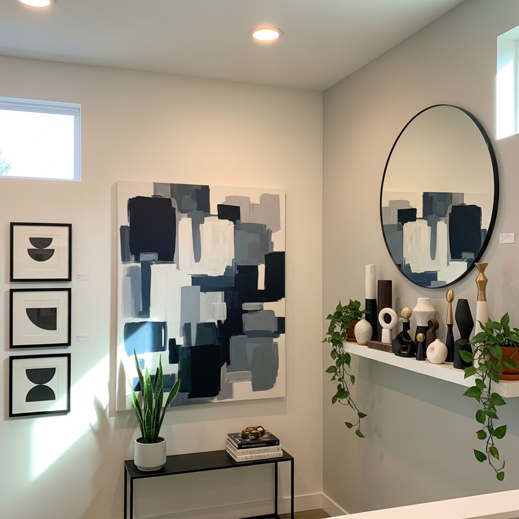 Decorative mirrors transform narrow or dark hallways by reflecting light and visually enlarging the space. Abstract or geometric frames add modern flair.