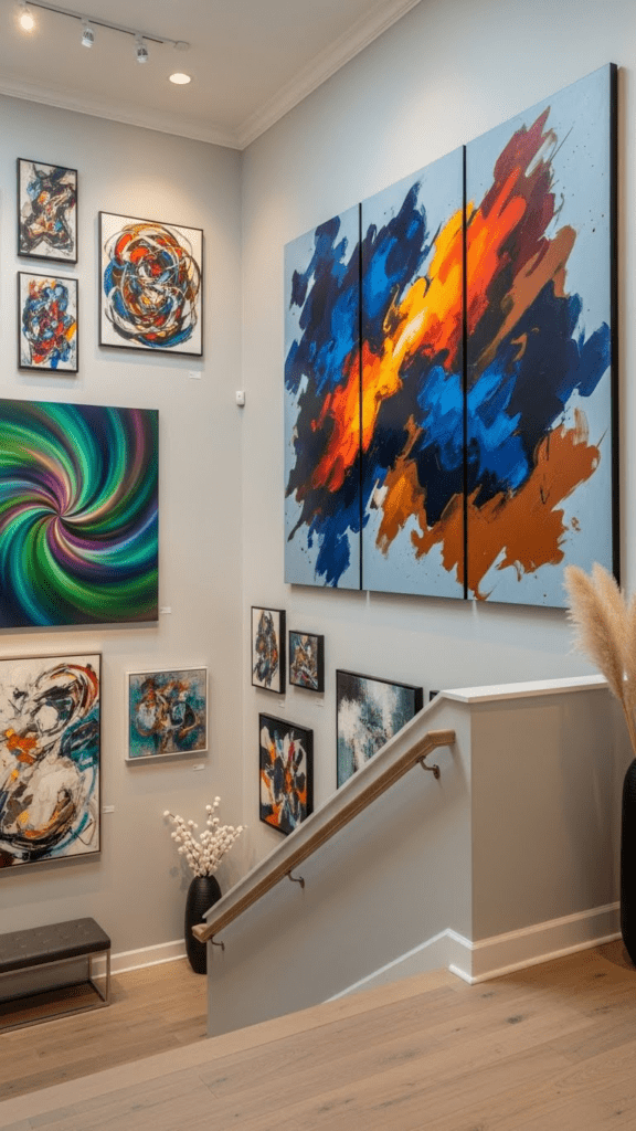 Pair large-scale art with neutral walls to let colors and shapes shine. This approach works beautifully in narrow upstairs corridors or wide gallery spaces.