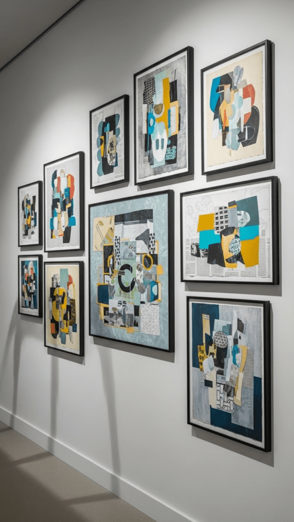 Mixing paintings, prints, and found objects in a wall collage creates a unique, modern gallery experience. This approach allows you to showcase your personality and style.