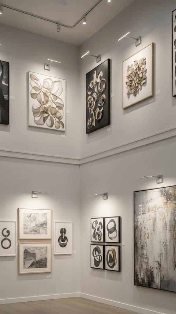 Adding subtle wall-mounted lights can showcase your gallery pieces effectively. Minimal fixtures maintain a clean, modern aesthetic while illuminating your art.
