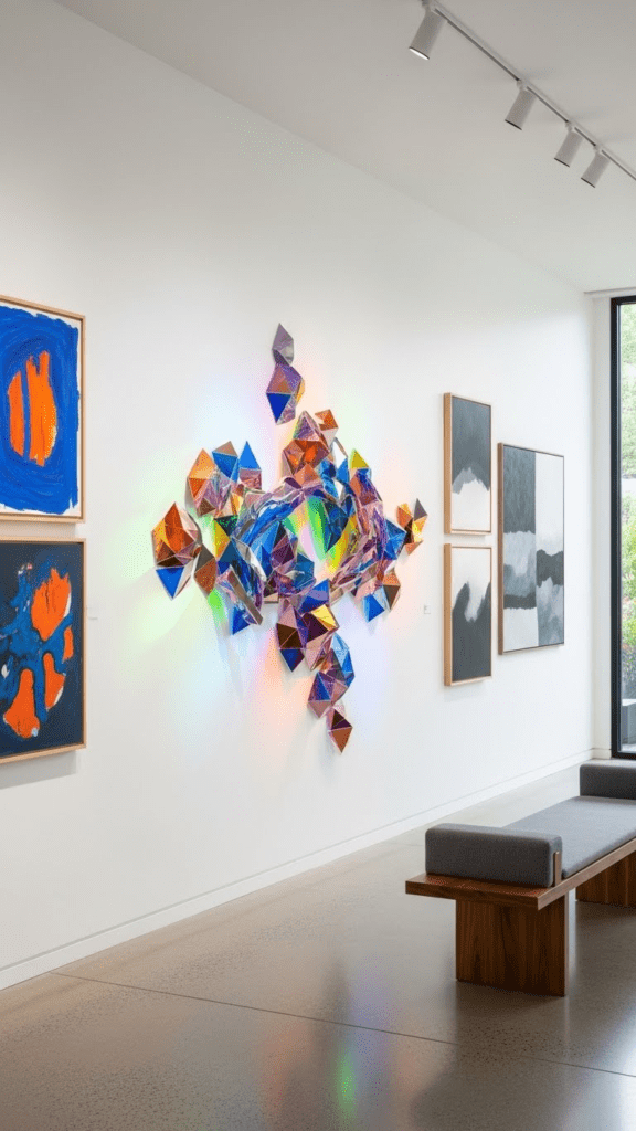 Three-dimensional wall sculptures provide depth and intrigue in an upstairs gallery. Modern materials like metal, wood, or resin create a tactile, sculptural effect.