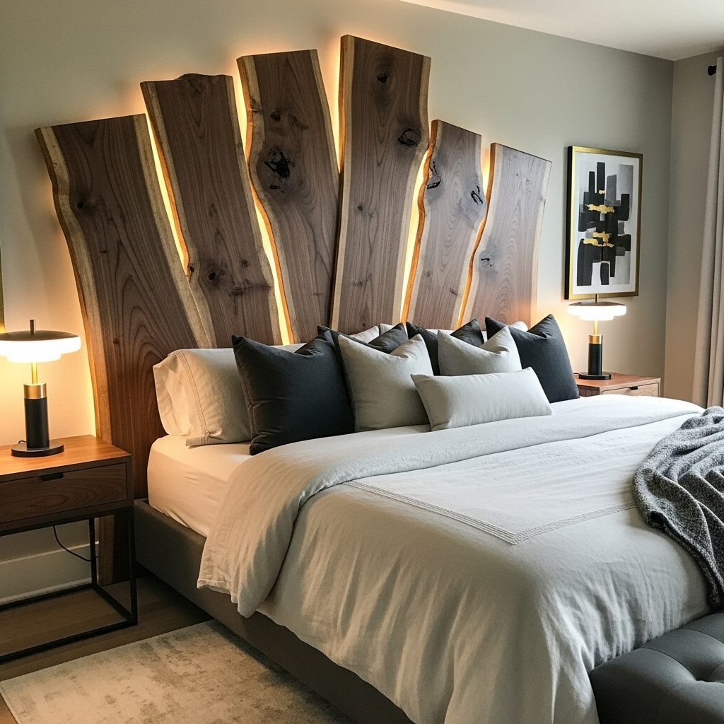 For a show-stopping natural element, mount a raw, live-edge wood slab that spans the width of your bed.