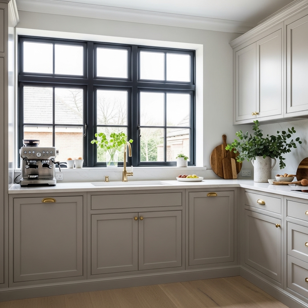 Add brass handles or a warm-toned backsplash to complete the look. Green tones are versatile and add a subtle yet elegant focal point.