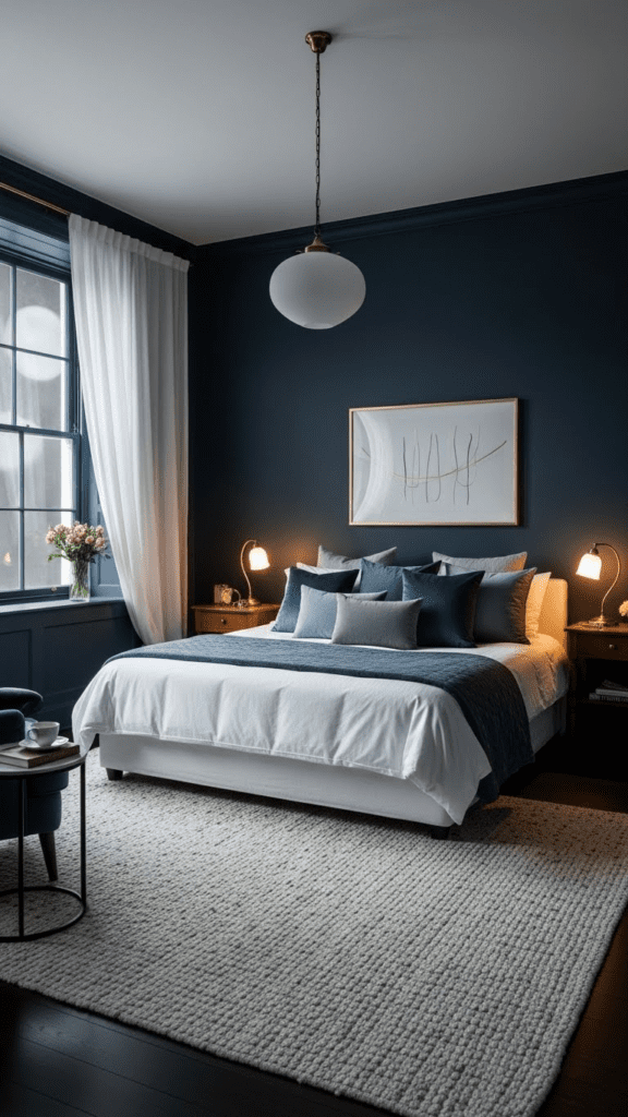 Navy blue acts as a sophisticated neutral that creates a cocoon-like feeling of security and deep rest.