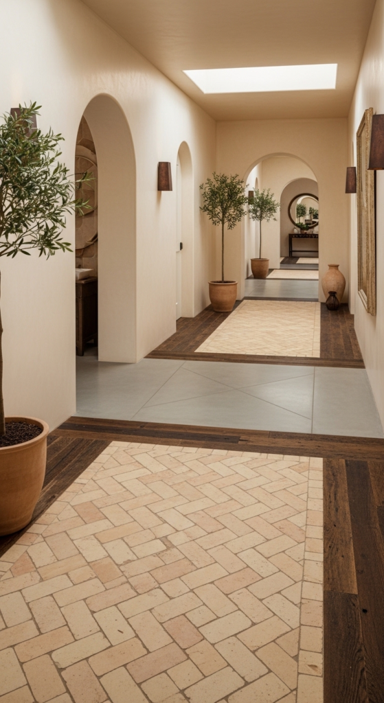 Creating a focal point underfoot is a beautiful way to enhance Modern Mediterranean Hallway Designs. Opt for muted blue or sage green ceramic tiles to create an artistic and welcoming atmosphere.