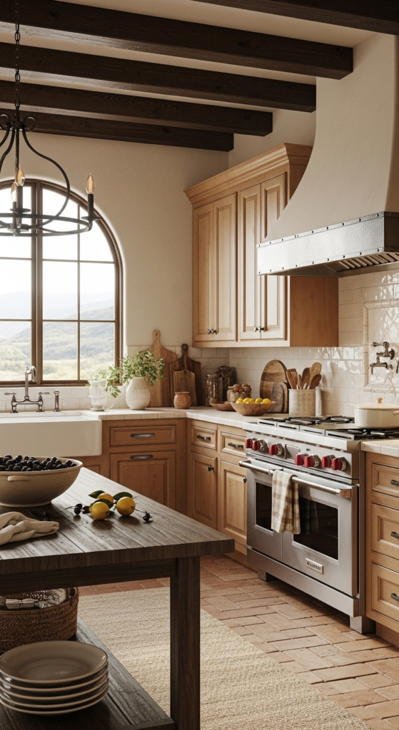Incorporating Mediterranean Kitchen Design Ideas into a high-ceilinged home often calls for adding some architectural weight. Choose dark, reclaimed wood beams to create a grounded and inviting atmosphere.