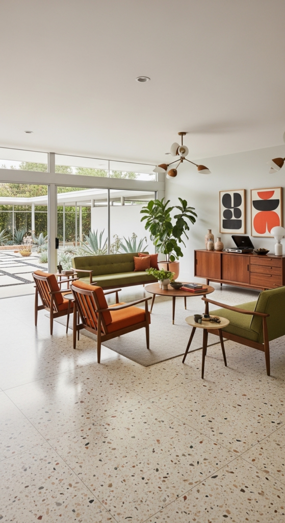 Revisiting classic materials is a stylish step when applying Mid century modern aesthetic home timeless ideas. Opt for terrazzo tiles with multi-colored stone chips to create a durable and welcoming atmosphere.
