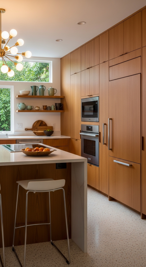 Selecting deep, warm wood finishes is a fundamental step when pursuing Mid century modern aesthetic home timeless ideas. Opt for walnut or teak cabinetry to bring a sense of natural luxury and organic warmth into your kitchen.