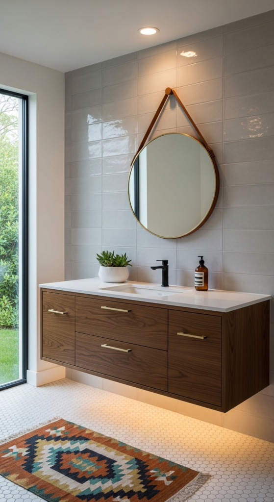 Updating your washroom is a sleek step for modern Mid century modern aesthetic home timeless ideas. Opt for a wall-hung wood vanity with a vessel sink to create a modern and welcoming atmosphere.