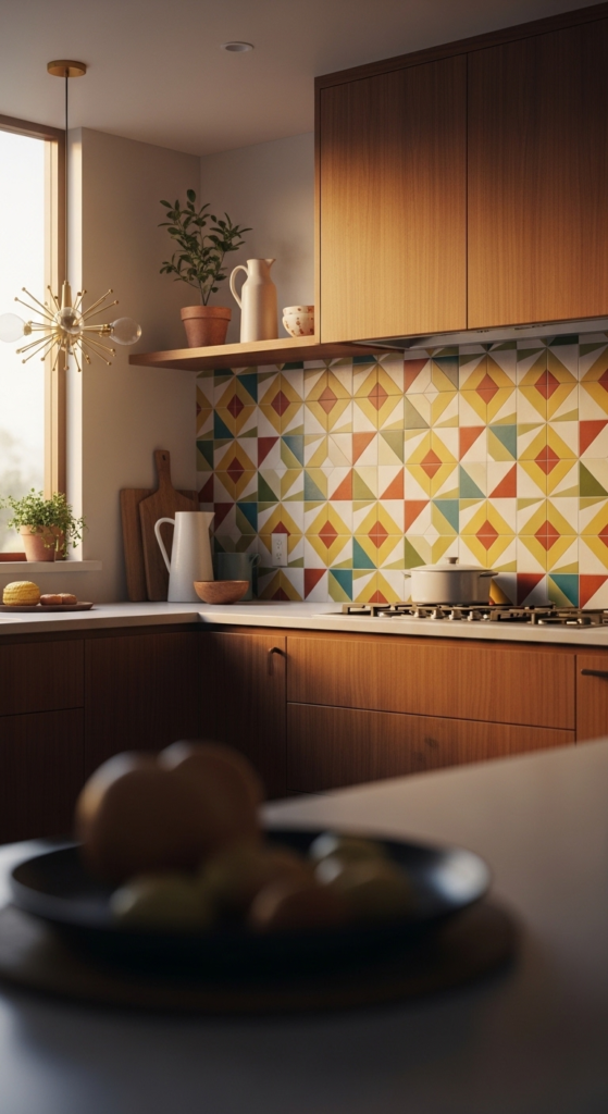 Adding pattern to your walls is a creative step when applying Mid century modern aesthetic home timeless ideas. Opt for white picket or hexagon tiles to create a textured and welcoming atmosphere.