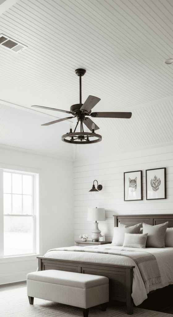 Pairing this with a dark-colored ceiling fan or a rustic chandelier creates a stunning contrast that feels very high-end. It is a “pro-tip” for those who want their Cozy Farmhouse Bedroom Designs Ideas to stand out from the crowd.