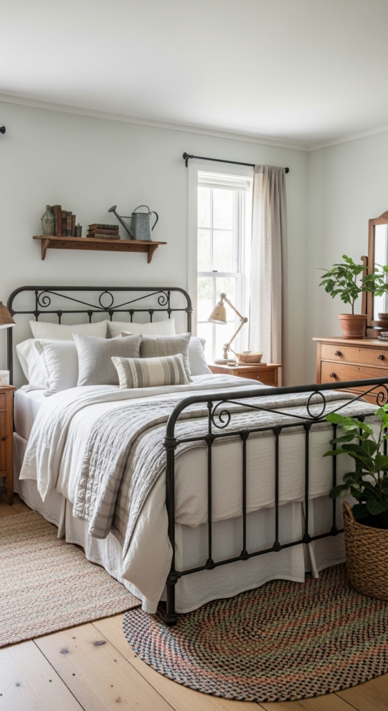 A sturdy black or white iron bed frame serves as the quintessential anchor for most Cozy Farmhouse Bedroom Designs Ideas. Its open silhouette keeps the room feeling airy while providing a vintage, storied look that never goes out of style.