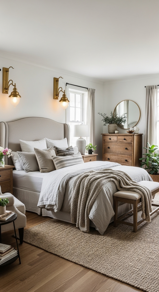 Neutral walls act as a versatile canvas for your seasonal decor, allowing you to swap out pillows and art with ease. This “soft-focus” color palette is essential for achieving a high-end and Cozy Farmhouse Bedroom Designs Ideas look.