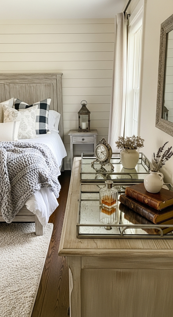 Incorporate small metallic accents through hand-hammered silver or pewter trays on your dresser or nightstand. These trays provide a cool, reflective surface that adds a touch of quiet luxury and “Parisian-farmhouse” sparkle.