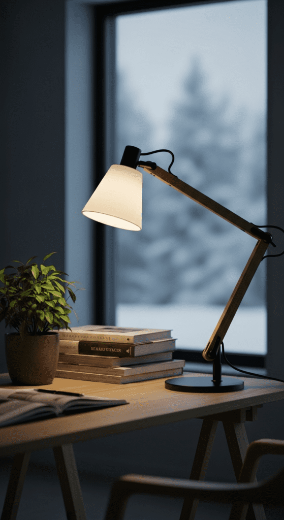 Metal or wooden desk lamps in minimal forms add style. Adjustable lighting improves usability.