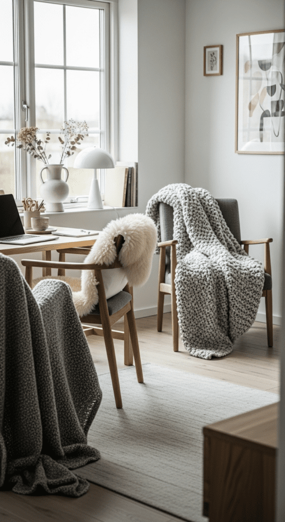 Layering textiles promotes a hygge-inspired workspace. Comfort supports creativity and relaxation.