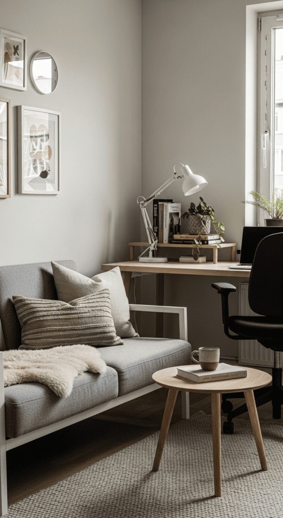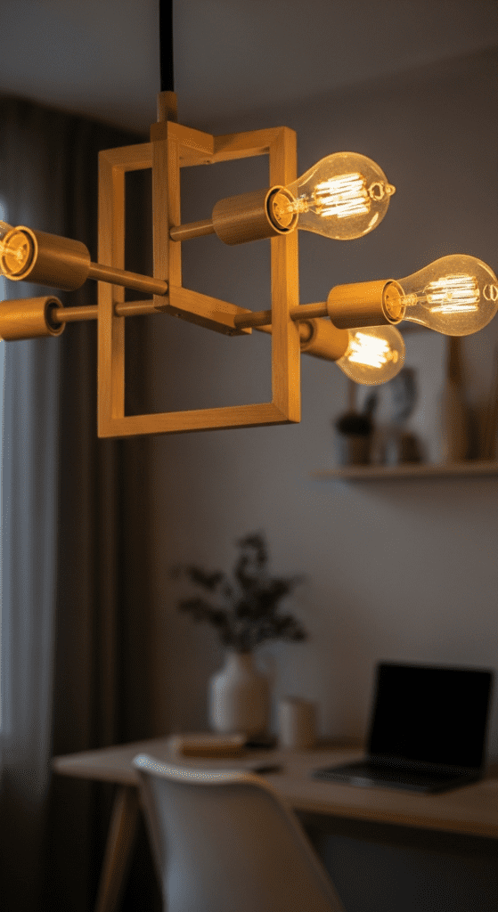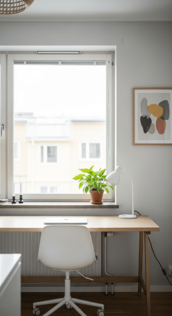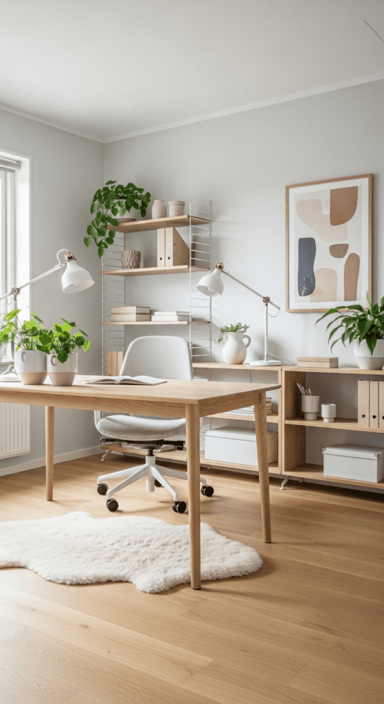 Minimalist fixtures complement Scandinavian decor. Layered lighting makes the office functional and stylish.