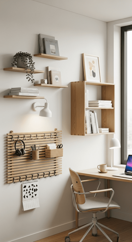 Pegboards or hooks organize tools and decor. They keep surfaces free while adding design detail.