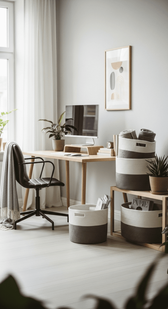 Baskets keep essentials handy. Natural materials support warmth in minimal spaces.