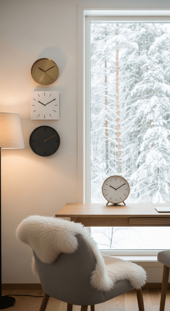 A simple wall or desk clock adds utility. Clean lines and muted tones prevent distraction.