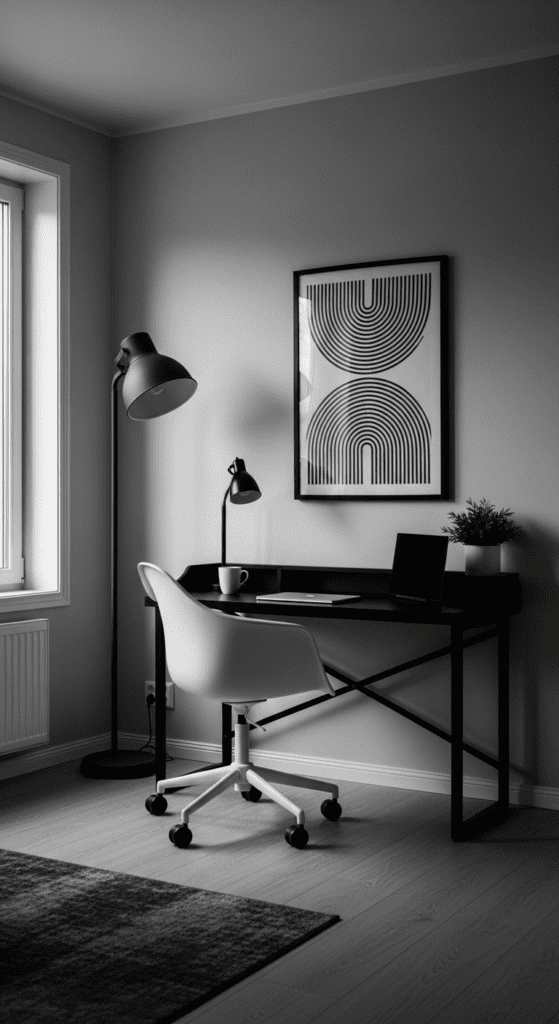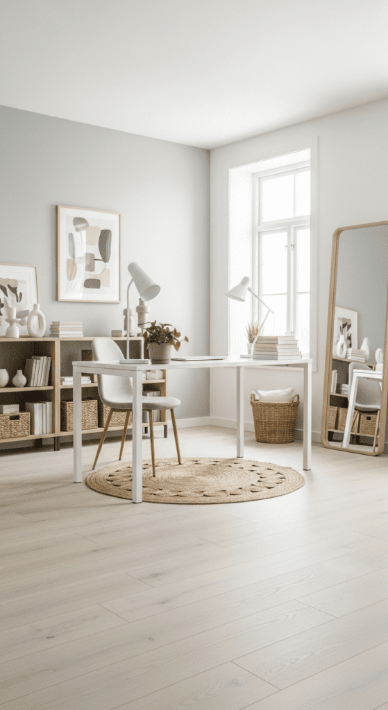 Soft whites, pale greys, and muted beiges define Scandinavian home offices. They reflect light and create a bright, open feel.
