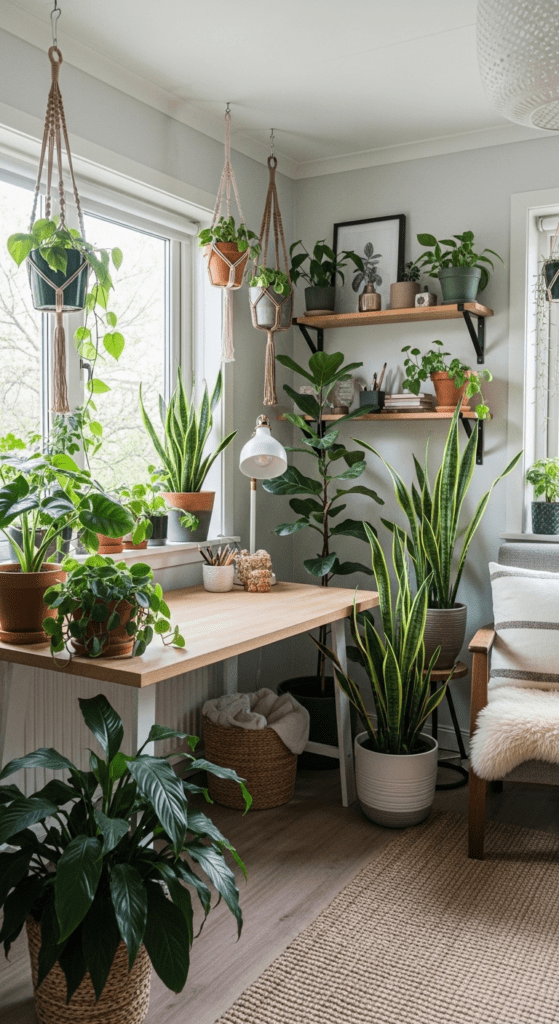 Indoor plants bring freshness to any home office. Potted ferns, succulents, or trailing vines feel alive and lively.