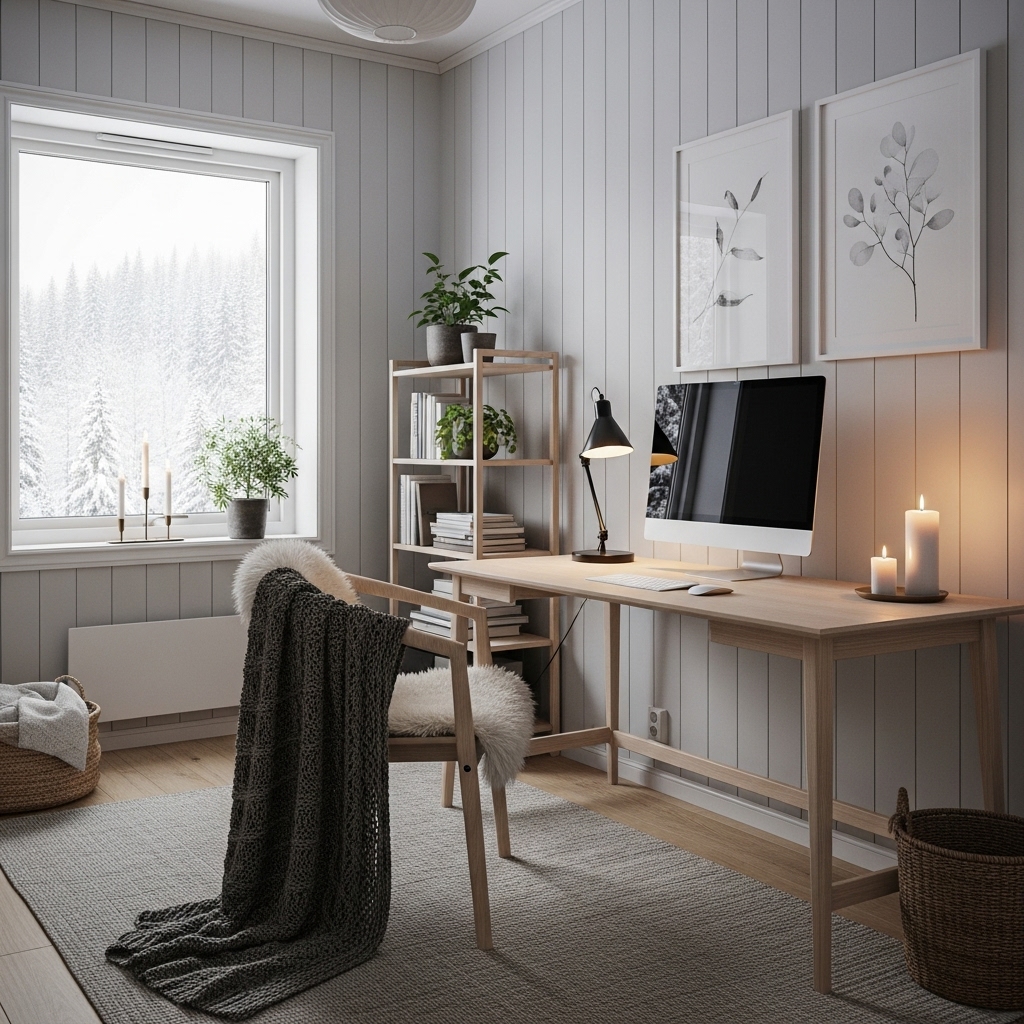 Soft whites, pale greys, and muted beiges define Scandinavian home offices. They reflect light and create a bright, open feel.