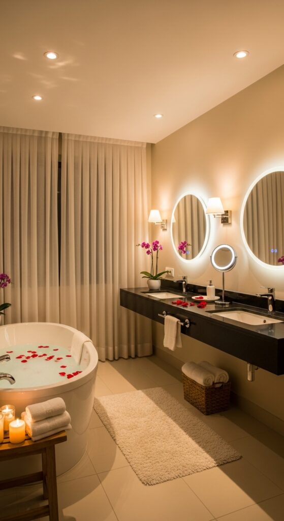 Soft lighting is key to creating a spa-like, calming vibe in your couple’s bathroom. Harsh overhead lights can feel clinical, while warm, diffused lighting instantly relaxes the mood.