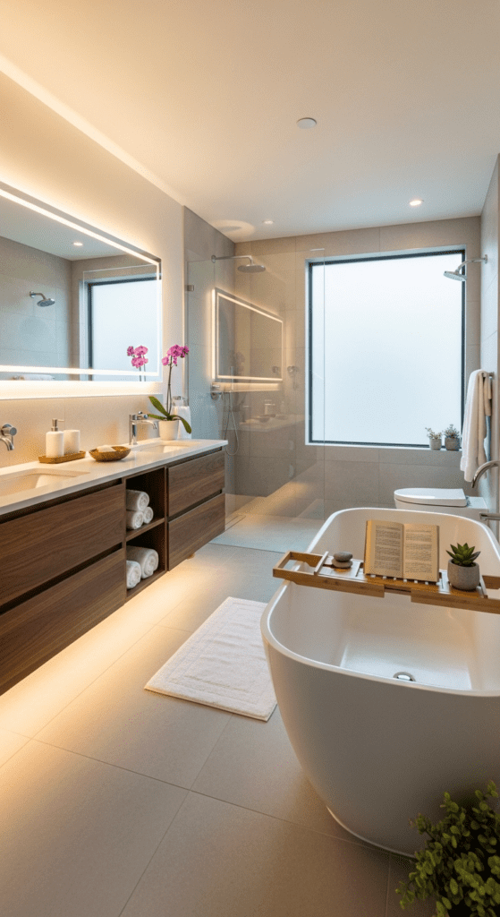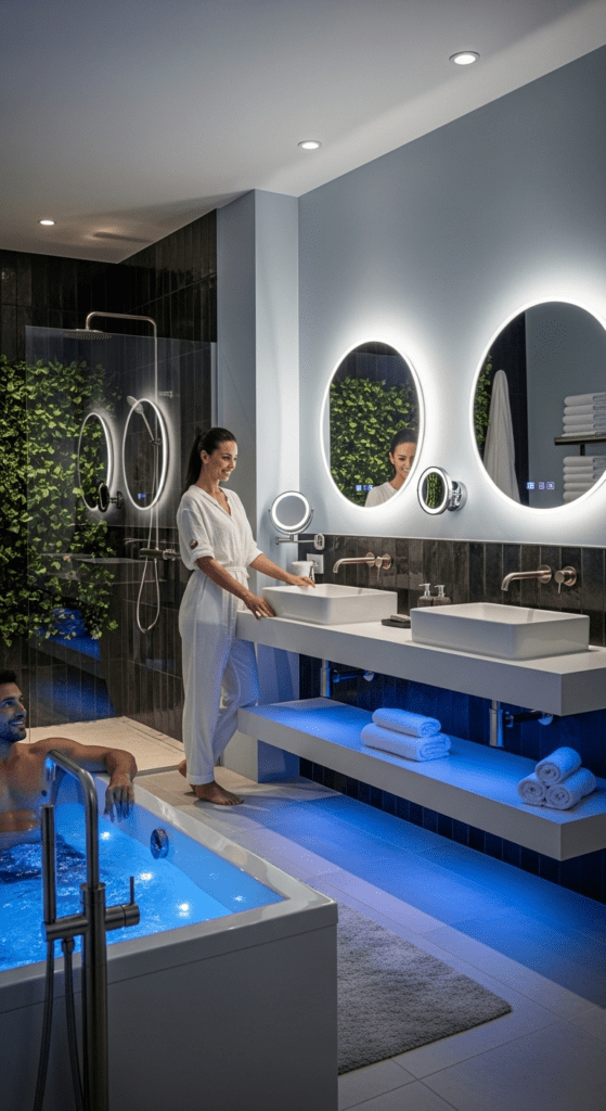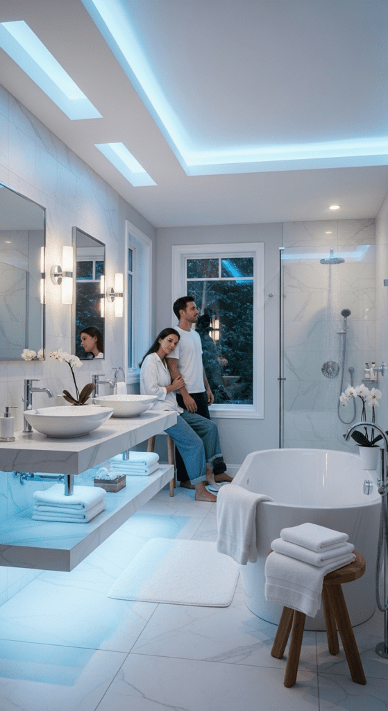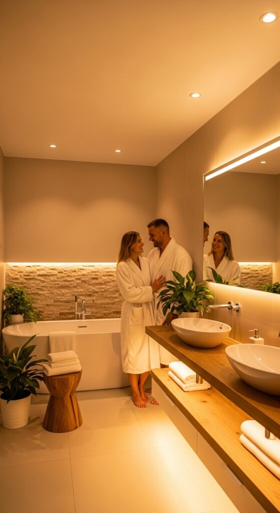 Accent lighting, like LED strips under floating vanities or within shower niches, can create dramatic effects and highlight architectural features, enhancing the spa atmosphere.