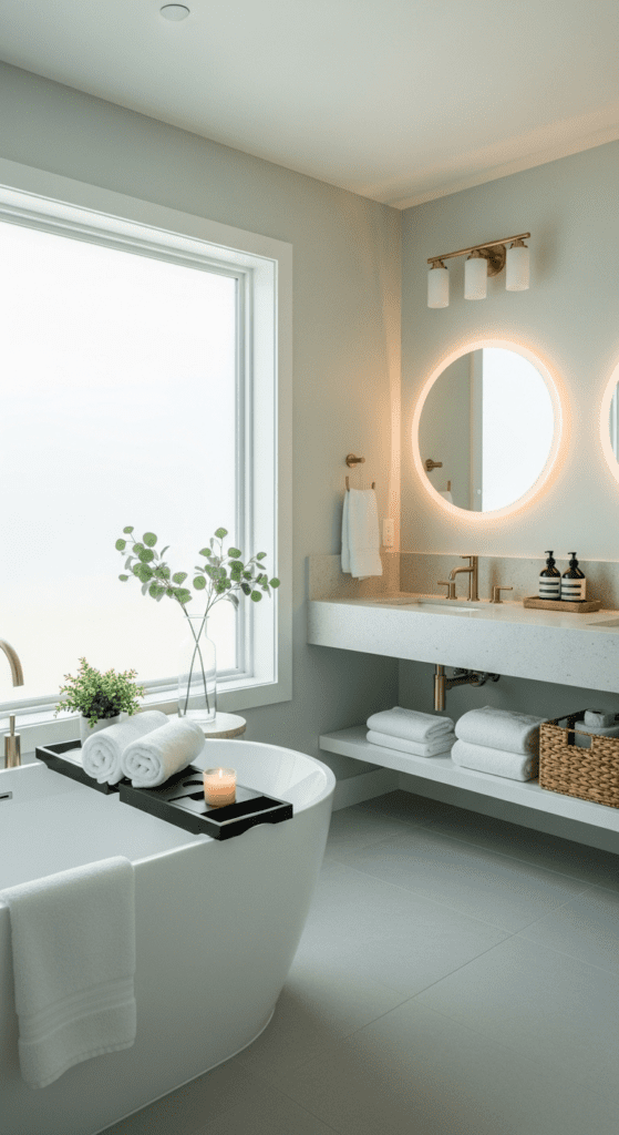 Modern technology can seamlessly enhance the comfort and convenience of your spa-like bathroom. Smart mirrors with integrated lighting and defoggers offer a sleek, functional upgrade.
