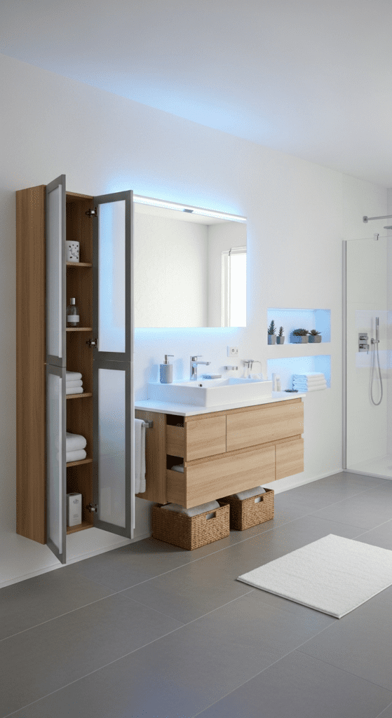 Utilize vertical space with tall linen cabinets or wall-mounted units to maximize storage without encroaching on floor space. Every item should have its designated place.