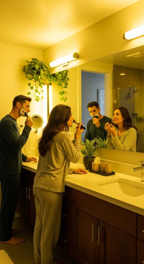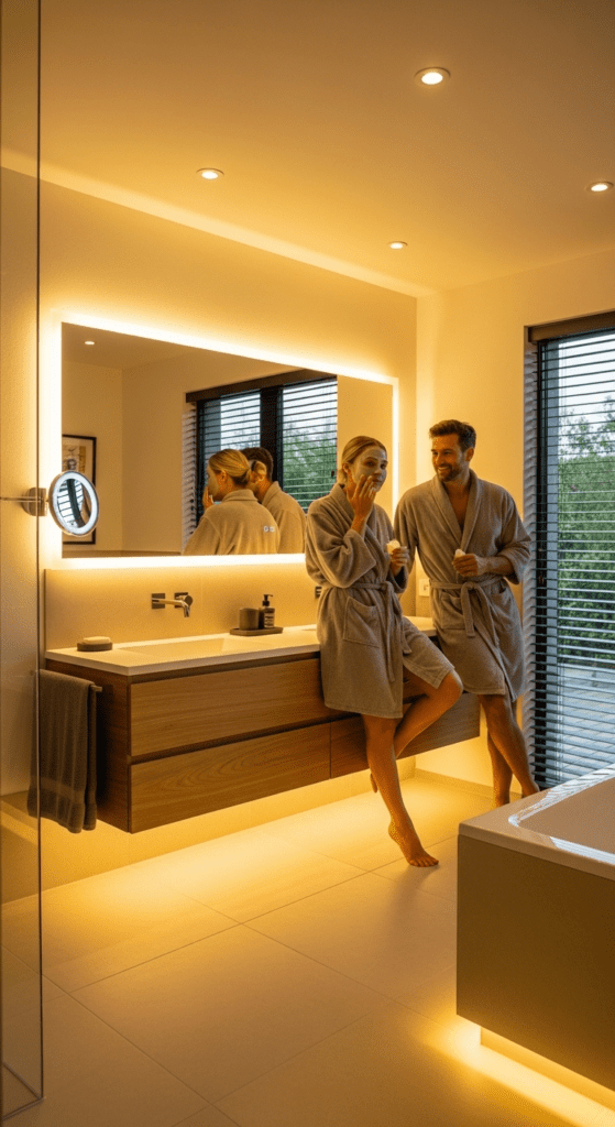 Combine ambient lighting, such as recessed ceiling lights, with task lighting around vanities for practical use. Dimmers are essential for adjusting brightness to suit any occasion.