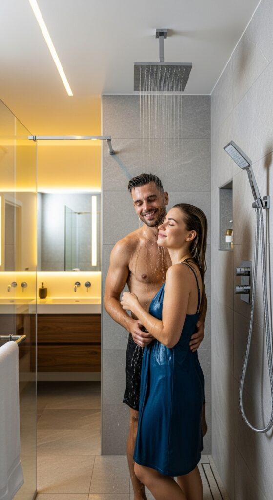 This expansive and well-appointed shower transforms a daily routine into a shared moment of rejuvenation and intimacy, truly embodying the essence of a modern spa bathroom.