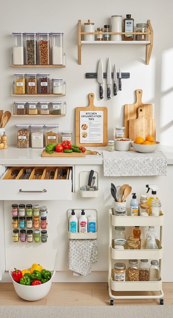 Keeping your kitchen organized makes it both functional and visually appealing. Use drawer dividers, baskets, and labeled containers to keep items in order.