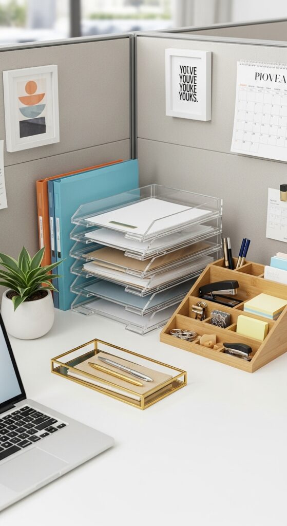 Use trays, file holders, and pen cups to keep supplies sorted and easily accessible. A coordinated set instantly makes your cubicle look more intentional and polished.