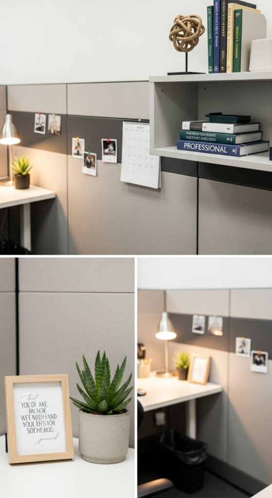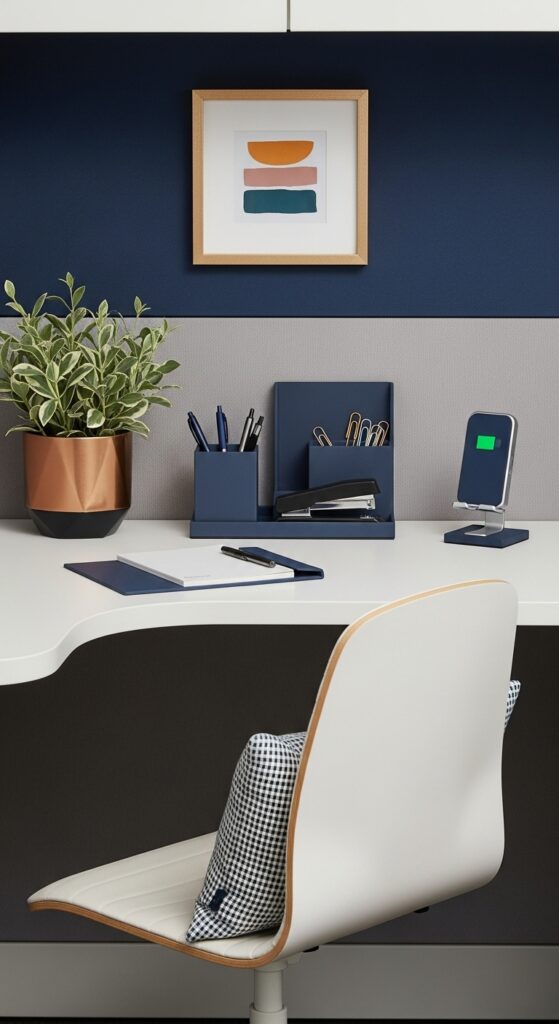 A calming color palette helps set a peaceful, focused mood in your cubicle. Soft tones like beige, light grey, or pastel blue can instantly make the space feel more open and less chaotic.