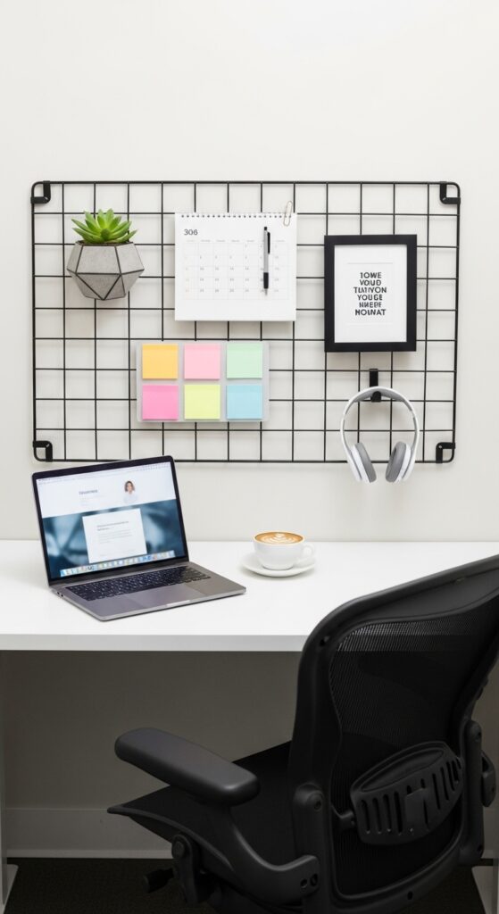 Opt for a sleek metal grid or a soft-colored pegboard to maintain a professional appearance. You can clip on photos, to-do lists, or even tiny plants for a touch of personality.