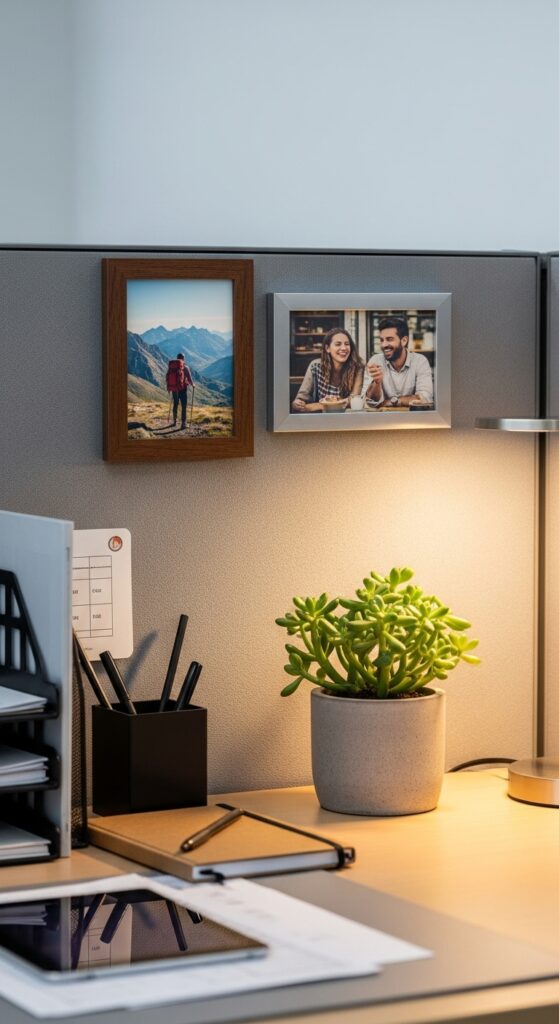 Plants also help purify the air and create a sense of calm, making your cubicle feel more welcoming and alive without taking up much space.